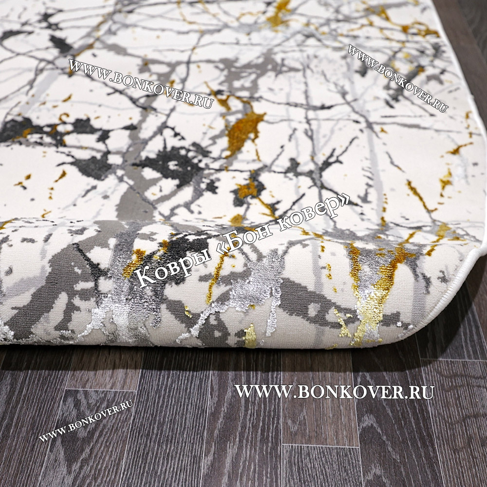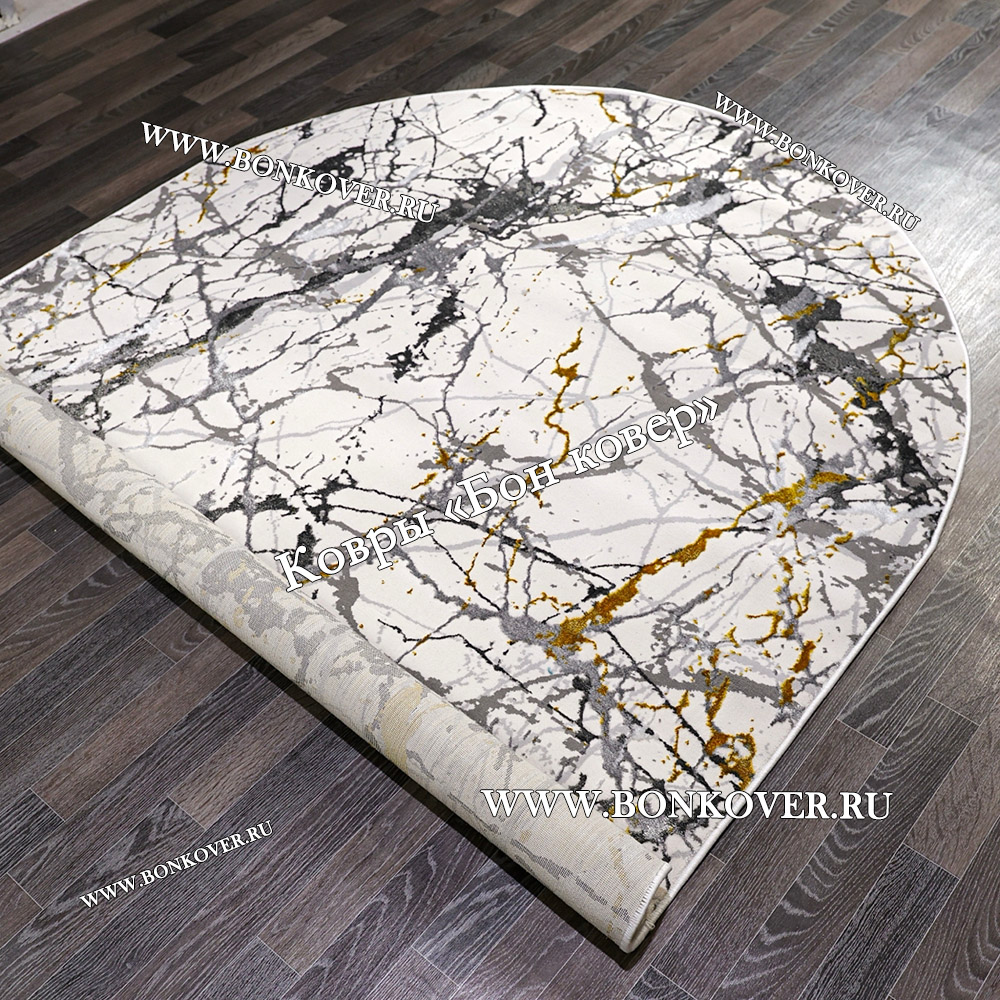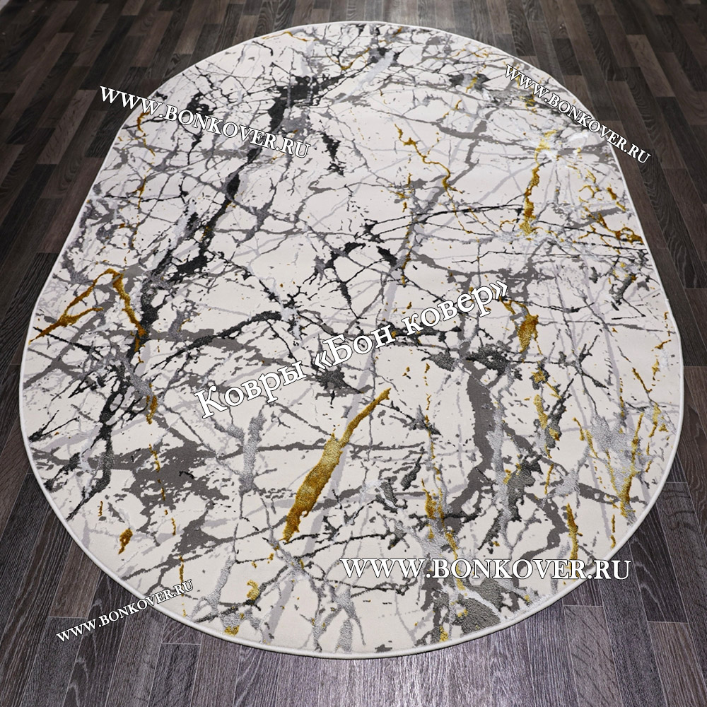 Импозантный Турецкий Овальный Ковер Белый с Золотистым дизайн 05 наполняет интерьер жилого пространства теплом и уютом, гармонично сочетает в себе изящество и красоту. Он соткан из современных материалов, комфортный и долговечный.